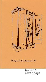 To be exact, I lost my enthusiasm in 1993, but this is the first moment since then when it looked as if the magazine wouldn't fold if I left. I dislike almost all aspects of being an editor except choosing the poems, which takes about ten minutes a year. Writing about 100 letters for each issue. Having no grant for 15 and 17 meant a considerable drain on my pocket. The last time I stopped (in 1995?), it was a huge relief, and I regret going back to it. I read an interview with Mark Eitzel of The American Music Club where he's talking about making a promo video: "I'm in a dunking booth, and every time the word Rise happens I fall in the water. There's dancing girls, it's corny. They've got these real bad mermaid outfits, they're tacky girls and they know it, y'know? We had them dance out of time to the music. At one point they said, This music is too slow, don't you have anything like Metallica". I used to identify with Mark Eitzel (loved those AMC albums) but increasingly I identify with the girls in the fish costumes: every time I read submissions I just mutter "Don't you have anything faster?" But, the scene needs a decent poetry magazine. In a 25 year history, Angel Exhaust has had 3 5-year breaks. The third has just finished. Lucky old world. I became involved in the project that became Angel Exhaust version 3 in autumn 1991 and negotiated a withdrawal in December 1998. In between, the magazine published more than 100 different poets and more than a thousand pages of text. The continuation of the counter-culture by brilliant poets after its demise was our initial area of interest; faced with claims in the Bloodaxe The New Poetry (imitating Morrison and Motion) that nothing of great interest happened in the sixties and seventies. On the contrary, sheepshanks, there was a poetic revolution, and most of the interesting poetry of the nineties was a direct consequence of it. Exchanges on the British poetry messaging network have equated me, and Angel Exhaust, with the Gulf War. Apparently AE was also the product of aggression and "bedded with money" and so just like the military-industrial complex. When raising some new ideas is seen as aggression, it's easy to discover that the regulars of the small press world are territorial, conservative, and obsessed. This sensitivity and territorial bulk make movement difficult. We took a lot of flak for pointing out that bad poets loved the counter-culture, i.e. the equivalent of "progressive music wasn't all wonderful". This attitude proved unacceptable to the counterparts of ELP, Uriah Heep, and Widowmaker. We didn't indulge baffled old bozos from the bottom of the pond, wandering round telling strangers that "I could have been bigger than John James". Olsonian occultists with CHAS tattooed on one set of knuckles and DAVE on the other. How society really works, by sources close to the Lobster Men of Pascagoula. Sound poetry by Colonel Mustard. Mussolini, he was there, Shooting peanuts in the air. So it was also claimed on one of the mud chutes of the Internet that my reviewing policy was a breach of loyalty to the community. This is only so if you exclude from that community almost everyone who reads poetry. From the outside, the gap between Neil Astley and Bob Cobbing is only about a millimetre, and the idea that there is a bitter opposition between the two is puzzling. I identify with the poetry world as a whole, and this makes it impossible to share the tiny avant-pond's totalitarian self-regard; which, indeed, is soaked in latent hostility to everyone else, whose legitimacy they deride. Angel Exhaust-a skyful of F-111s? a skiff a-skimming across the scams? or two blokes in haddock suits? In a leisure culture where everything is self-referential and unnecessary, the acquisition of loyalty is the moment of forgetting that the initial decisions have the status of decisions, and is therefore a block preventing perception. If entering a work of art means becoming somebody else, then imposing too many loyalty tests on what kind of somebody you're allowed to become can prevent the art process from proceeding. Loyalty is notoriously short-range and liable to give eccentric results for anything outside its range. I am very much concerned with the internal complexity of self-referential systems, but the precondition of this becoming visible is the awareness of its arbitrariness which is yielded by comparison with many other little self-referential systems. The interest of closely comparing a hundred different contemporary poets is that one catches glimpses of why we are different from each other. The border which people draw (different people in different places) between the free (arbitrary) and the bound (or traditional, organic) is a key device. Is individuality (what makes the commodity prizable) a function of what was there at the beginning, or is it a function of complexity, and hence late in arrival, something unforeseen that emerges from the juxtaposition of powerful autonomous patterns? Metallica recently did an album (2 CDs) of cover versions, releasing their enthusiasm for great music. Thirty years of "metal, thrash, punk, and post punk". They came, as a band, straight out of Lars Ulrich's huge collection of underground English heavy metal albums. I thought the magazine would be like this, a kind of personal tape of all the great things I loved from the past thirty years. It didn't turn out that way. An editor can say no to things but is otherwise uninfluential. A key influence on the project was Julian Sanderson, who gave me a long lecture (in 1991?) on why magazines had to have spines and be A5. His parents ran a bookshop, so he knew that something with no spine couldn't be exhibited properly and wouldn't sell. At that moment, AE became committed to the bookshop, and so to the world of competition and choice. This focus rapidly brought the realisation that the reader is not wrong. Another act of treachery, for the solidarity group of poets.