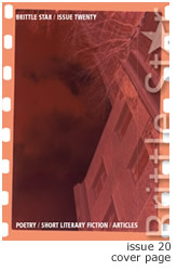Brittle Star welcomes submissions of unpublished, original work in the following categories: The editors would prefer to have submissions by post. Send with a brief covering letter, a brief biography (up to 40 words) and SAE to: Editors, Brittle Star, PO Box 56108, London E17 0AY. All contributors will be notified whether or not they are successful within eight weeks of the final submission deadline. See www.brittlestar.org.uk for deadline dates. Please note: we cannot accept work that is currently under consideration by another magazine. |