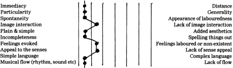 During one of Annie Bachini’s workshops a few years ago it occurred to me that something like this might work for making judgements about haiku. David Platt took the idea up and produced the mind-boggling computer program he described in BS10/2. The program has the great virtue of crunching a lot of variables. His current (evolving) parameters are as follows: