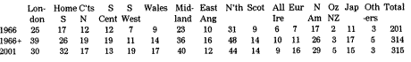 “The rows for 1966 and 2001 are the membership for those years, except for covert characters of no address. 1966+ is what 1966 would have been if the same as 2001...”