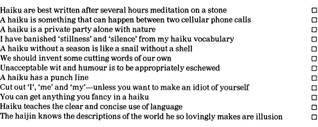 “Once the first networks are set up - and you remember one person may be a member of many networks - people can, so to speak, let their hair down. Then everyone answers another questionnaire, giving the answers they think X, let’s say, would give. Marks for each question are averaged, and we have the picture of how X appears to the haiku world.”